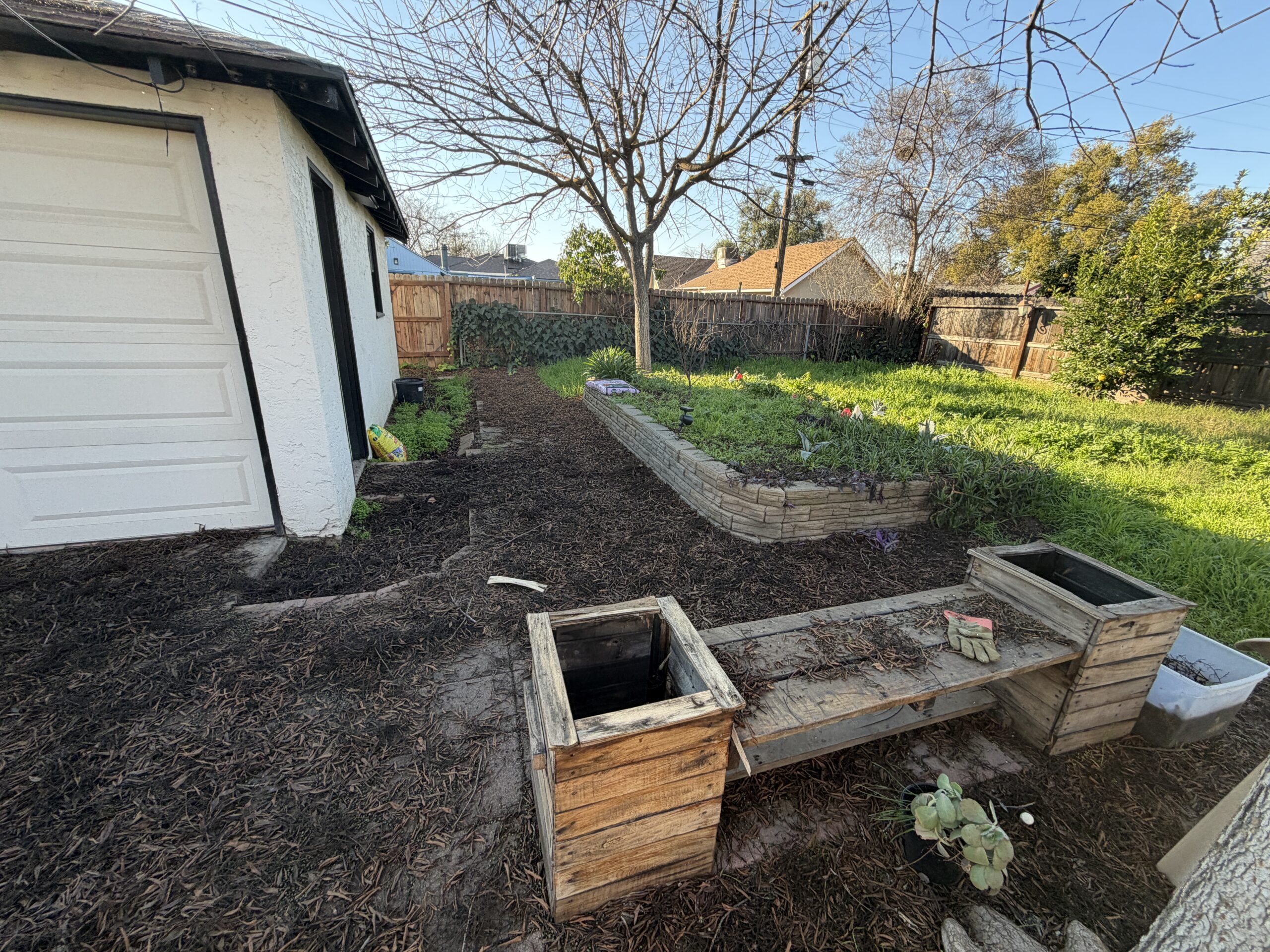 Beautified the back yard by removing some dirt and cutting in on the perimeter to install a bark base for aesthetics and overall curb appeal.
